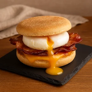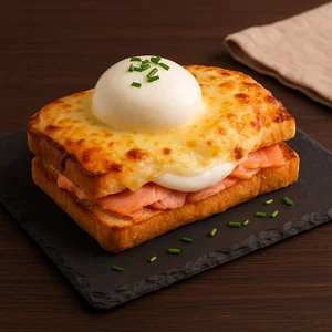 Pain de mie grillé garni, œuf poché et fromage fondant