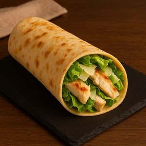 Tortilla grillée, poulet rôti, laitue romaine et copeaux de parmesan